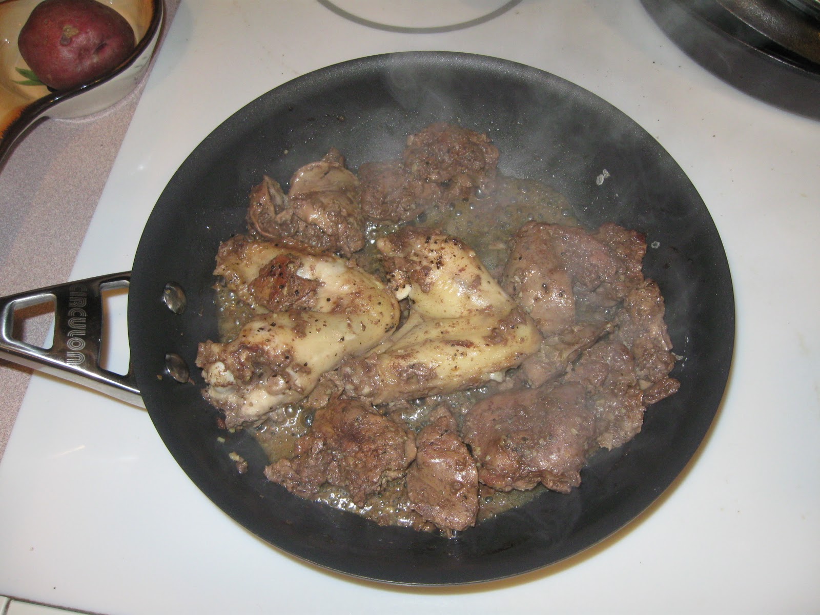 There is a reason I mentioned the hot pan multiple times. As I had the stock simmering all day, the breasts cooking in one pan, the wings and liver in another, a counter and sink full of dirty cutting boards and knives, a whining toddler who was arguing with my husband about washing his hands before dinner and finishing the chicken I had just pulled out of the oven, I grabbed the hot handle and burned my palm and 2 fingers. You’ve got to give me credit though. I wrapped my hand in a wet towel and finished cooking and plating my meal. Tears and all. L