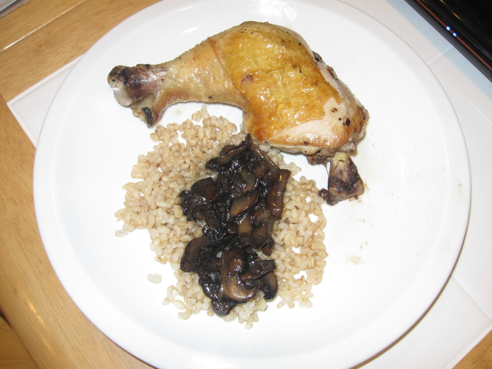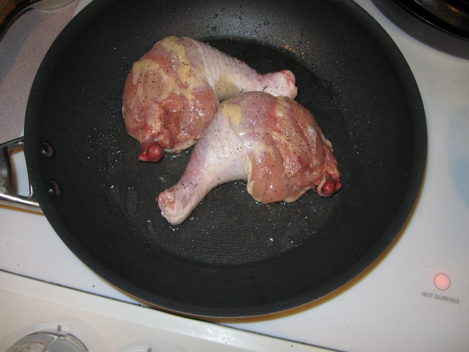 I had purchased a large package of mushrooms at Costco that I needed to use before they went bad. So I found a recipe to make with the thighs and mushrooms at foodwishes.com . The instructional video is an experiment using only these two main ingredients. The recipe says to use the breasts with the skin on but since I removed the skin from the breasts to make for my lunches I figured I could do the same thing with the thighs/legs.