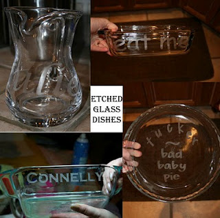 How genius is this, I found this on Diary of a Crafty Lady, use etching cream to etch your name or any message on glass. You could put your last name on all your baking dishes so if you go to potlucks or get-togethers you can make sure to get your baking dish back, or buy a pretty glass pitcher or dish and etch the persons name or wedding date and give it as a gift.