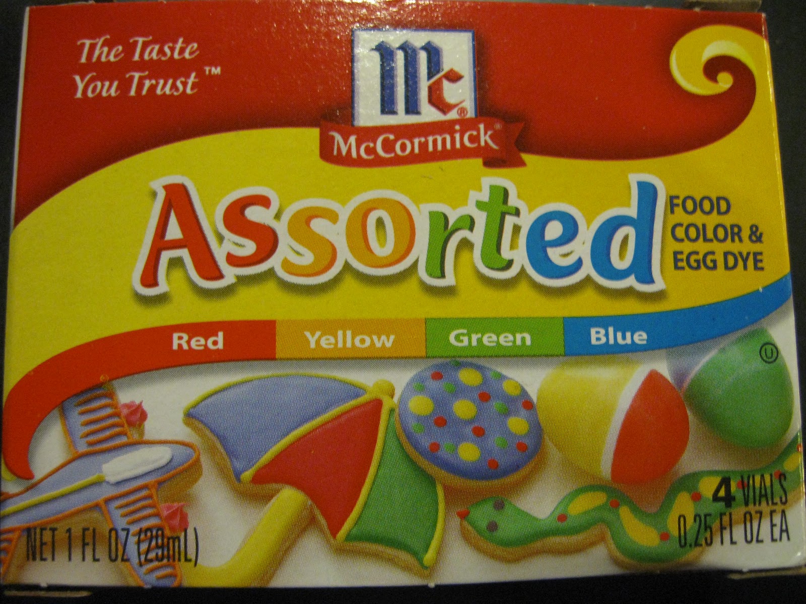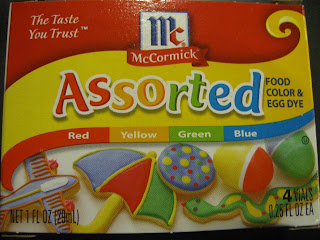 If you have McCormick brand the recipe is on the back of the box. You will also need boiling water, vinegar, and cups to make Easter Egg dye from food coloring.