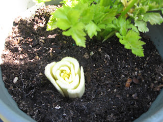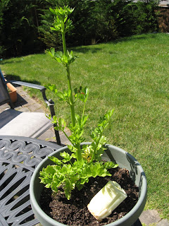 This is my celery I’m growing in my backyard just in a pot, I saw it on Pinterest (of course) so I had to try it, I started it with a base that I cut from a regular bunch of celery that I bought at the store. You can see right next to the growing celery is a base I cut today that I’m going to plant. This one tall stalk took a couple weeks to grow this big, there are some smaller stalks growing around it but I’m not sure if they will catch up.