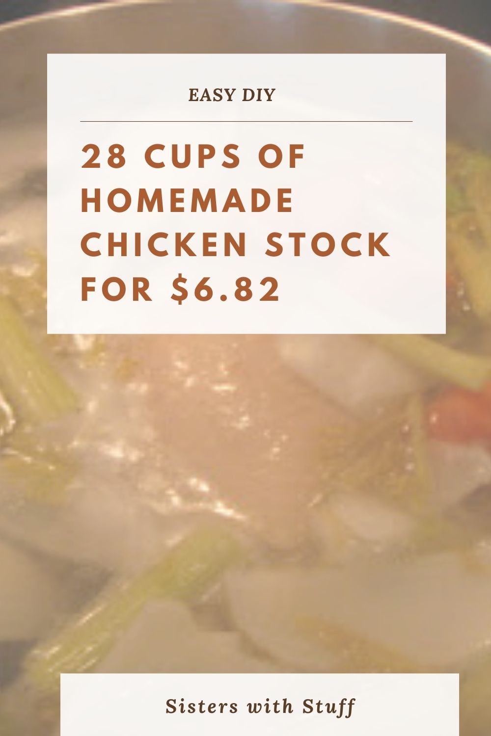 If you’ve been fearful about making your own stock, trust me, it is so easy and so yummy and so inexpensive to make. I got 28 cups of stock from this batch that I made a few days ago and it ended up being $ .24 a cup. 1 Whole Chicken $3.82 (I buy the Foster Farms chicken when it’s on sale for $ .88 a pound), Celery, Carrots, Onion, Garlic approximately $3.00.