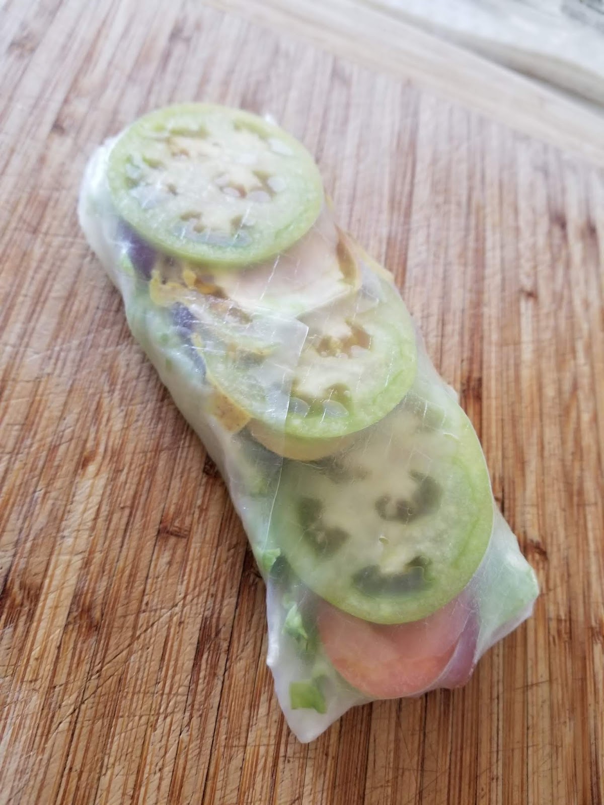 My husband doesn’t eat bread so I’ve gotten creative with alternatives. I used spring roll wrappers and added Dijon mustard to make a BLT – Bacon Lettuce Tomato wrap. I was also able to use more of my excess unripe tomatoes. Makes for a great carb-friendly snack or lunch!