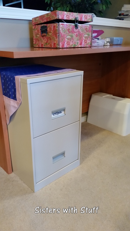 I needed more storage for my fabric., I sew for fun and you just collect mounds of fabric. I don’t know how it happens so fast, you buy some, people give you some. You find stuff at garage sales in the free bin and you just have to take it. So my fabric stash was starting to overflow and I thought if I spruced up the front of the file cabinet I could use it for fabric storage