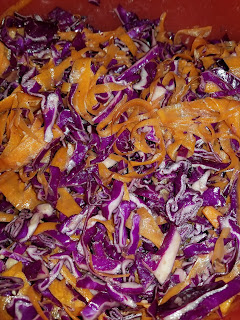 This year I hosted a holiday party which of course means lots of appetizer recipes. I made these yummy spring rolls, which were a hit by the way. I ended up with more than half a head of red cabbage (the red cabbage provided awesome color in my spring rolls). Cabbage isn’t something I typically use so I searched for recipes. In addition to several grilling and sauteing tips I found some pictures of really pretty coleslaw. All you need is the cabbage and carrots to make a gorgeous raw veggie dish.