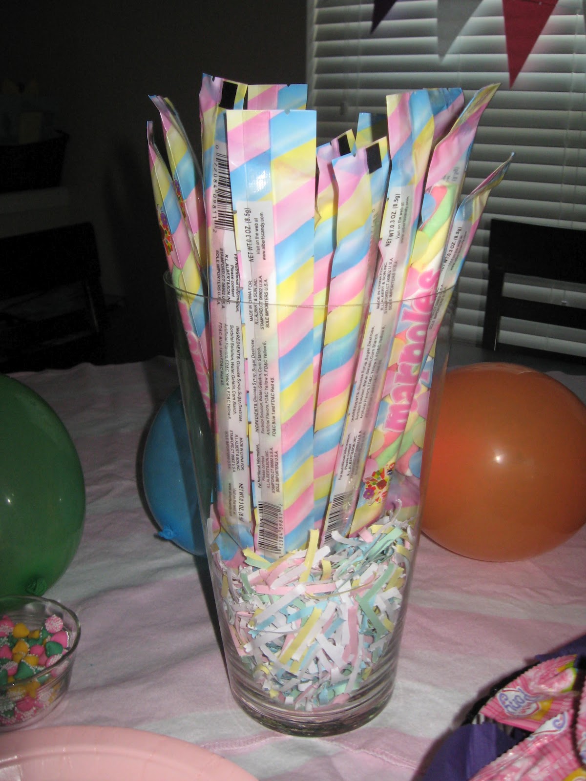 The marshmallow poles came from the dollar store, I thought they looked like unicorn horns. The vase I already had and I shredded the leftovers from the pennant decorations to put in the bottom of the vase.