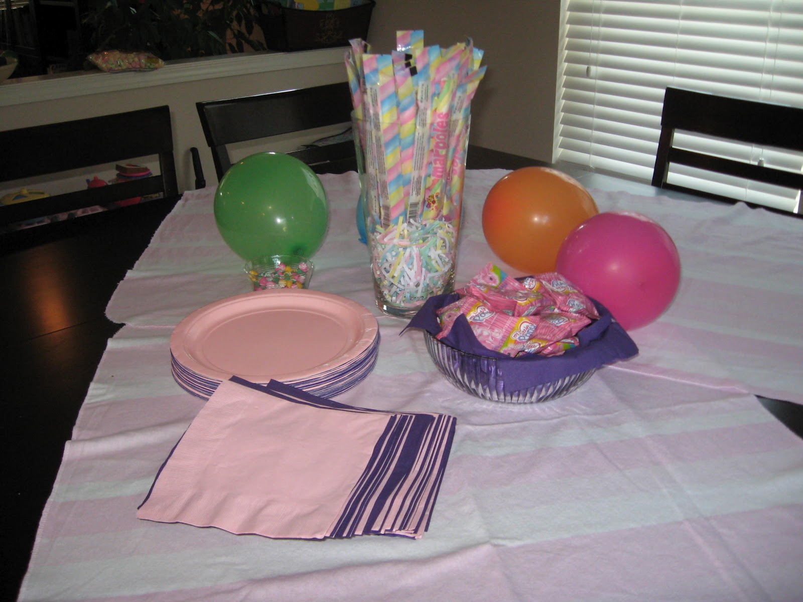 I ended up not buying a table cloth I just laid out some old baby blankets that were pink and white. I bought some of the smooth n melty mints that had the pastel unicorn colors that I was looking for. We blew up our own balloons (package of 25 from the dollar store) and hung a bunch from the ceiling with curling ribbon. There is a helium shortage in the US right now so I wouldn’t have been able to get them filled even if I wanted to.