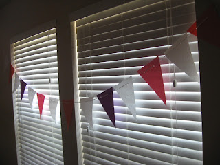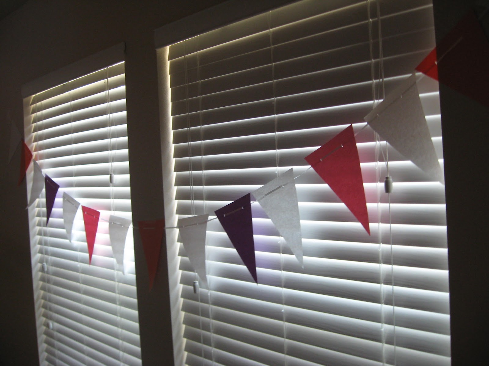 These pennants were easy to make. from 1 book of craft paper from the dollar store. I strung them around the room with curling ribbon. $2.00 approximately for the pennants.