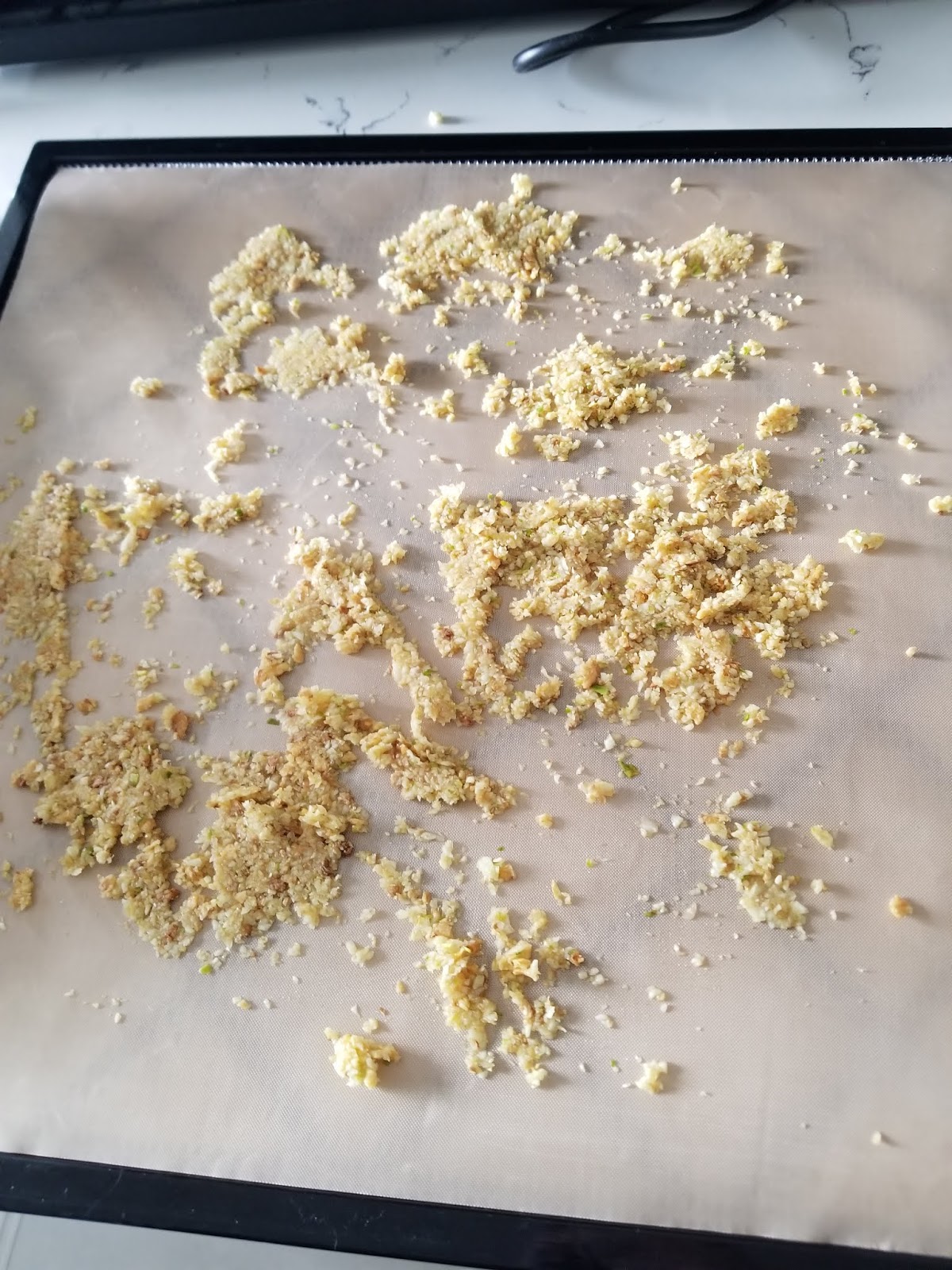 The first step is to remove all the skins. This is probably my least favorite part. Lucky for me, my son loved to use the rubber tube thingy I got at one of those home parties that will remove the skins if you roll it between your hands. So he did the hard work. If the bulb has started to grow a green shoot, cut it in half and pull out the sprouting shoot. It isn’t harmful but could make your garlic bitter. Chop the garlic as small as possible, even the hard dry ones. I used my Ninja Blender/Food Processor 450 Watt. You can use a blender or food processor. If you do it by hand, try to get the pieces as small and consistent in size as possible. The smaller/similar the pieces are, the more evenly they will dry.