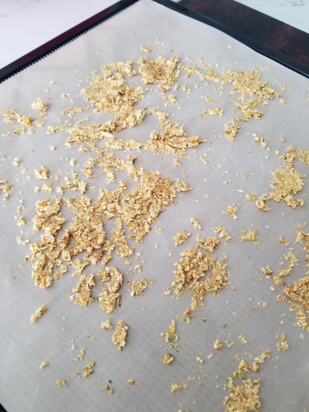 If you have a dehydrator you may need to use your fruit leather trays to prevent the minced garlic from falling through the grids. If you are using an oven, use parchment paper on a baking sheet. Spread the garlic pieces as thinly and as evenly as possible. This will reduce dry time and help to dry more evenly. I use the Excaliber Electric 9 Tray Food Dehydrator, you might like another article where I use my Dehydrator to make my own Citrus Powder.